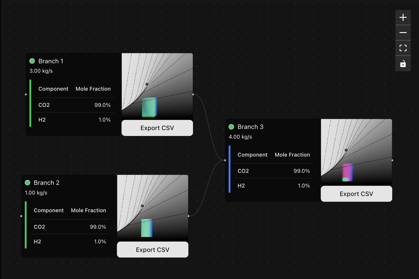The phase diagrams on each branch show the trajectories of all fluids within the source property range at the specified flow rate.