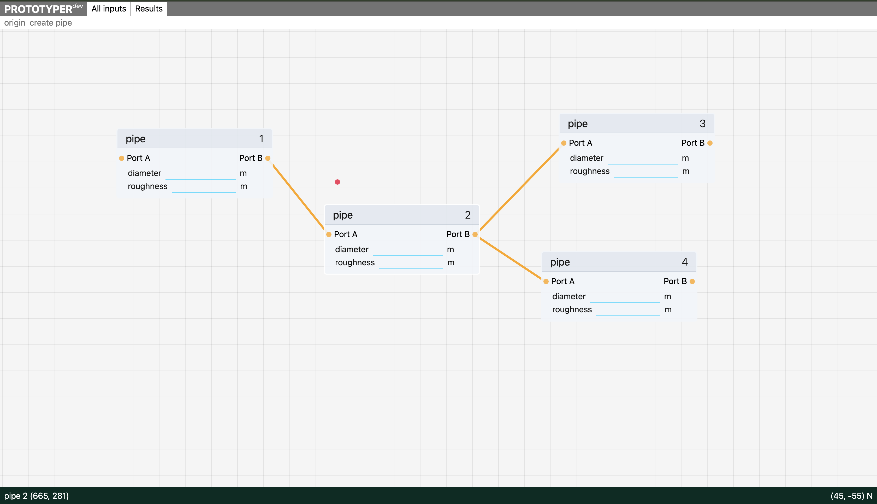 The property fields (diameter, roughness) in each box are more illustrative than necessary. Each branch would have its own set of properties that may or may not vary across its length. If you really wanted to rotate these, that could be possible, but the important thing is to know whether you’re connecting to Port A or Port B. Because the elevation at ports A and B may differ. The expectation though is that things flow from left to right, Port A to Port B.